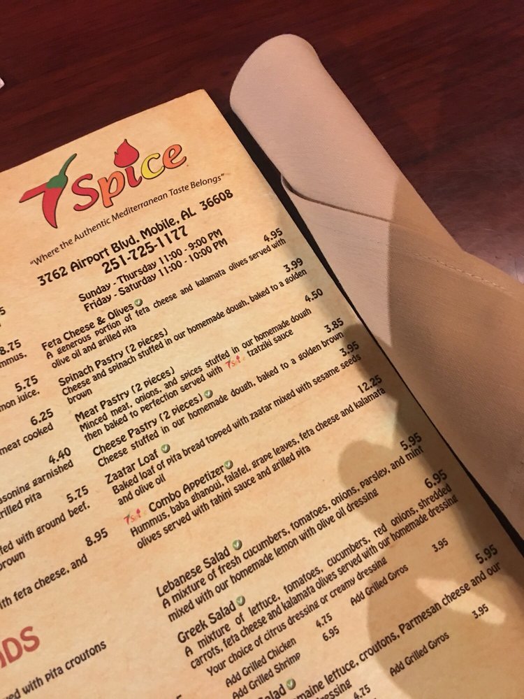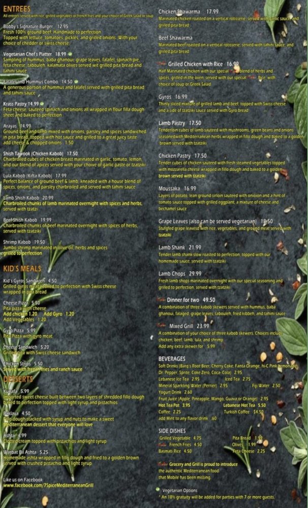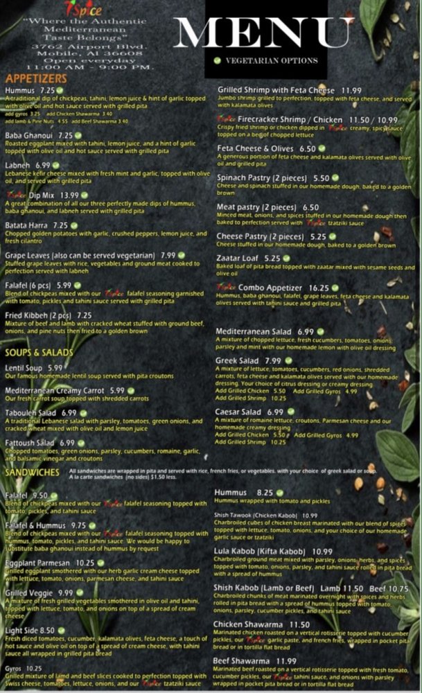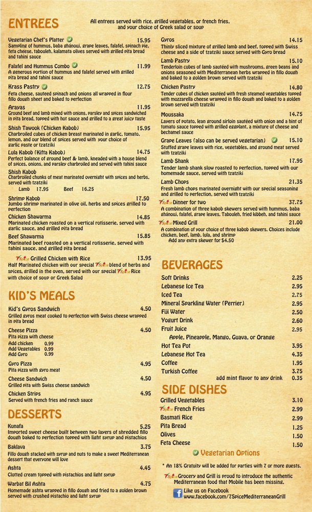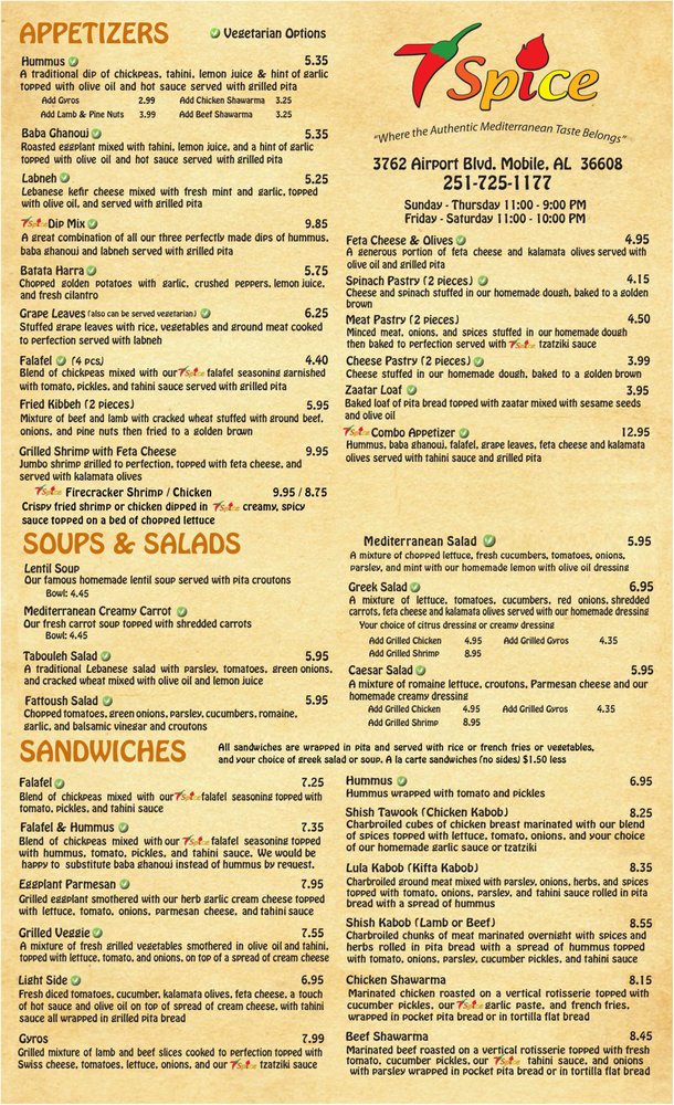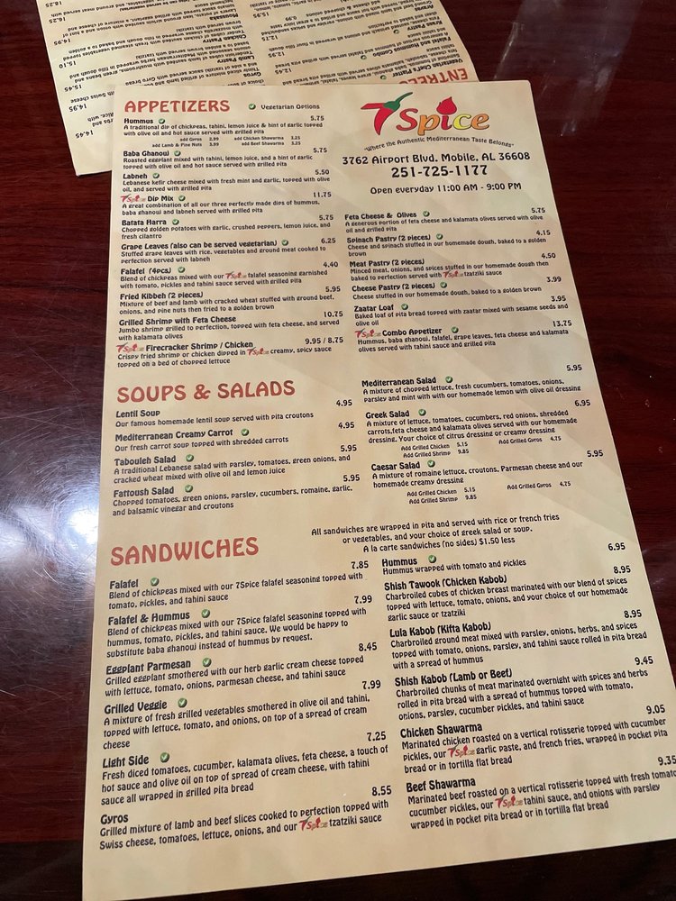 7 Spice Grocery & Grill is a hidden gem in Mobile, AL, offering a mix of Greek and Mediterranean cuisines. The menu features a variety of appetizers like hummus, falafel, and grape leaves, as well as delectable desserts including Kunafa and Baklava. Customers rave about the flavorful dishes such as the chicken shawarma and falafel. The atmosphere is described as reminiscent of a cozy Greek restaurant with friendly service. Diners appreciate the freshness of the ingredients and the generous portions offered at reasonable prices. The staff is known for their helpful recommendations and accommodating service. With a wide array of spices available for purchase in the front store, 7 Spice Grocery & Grill is not just a restaurant but a culinary experience for those seeking authentic Mediterranean flavors.