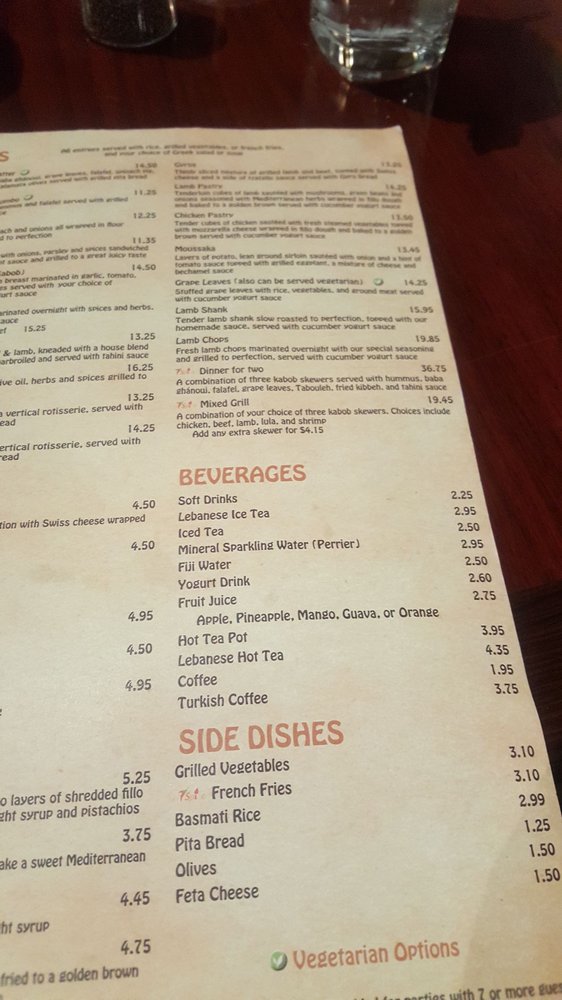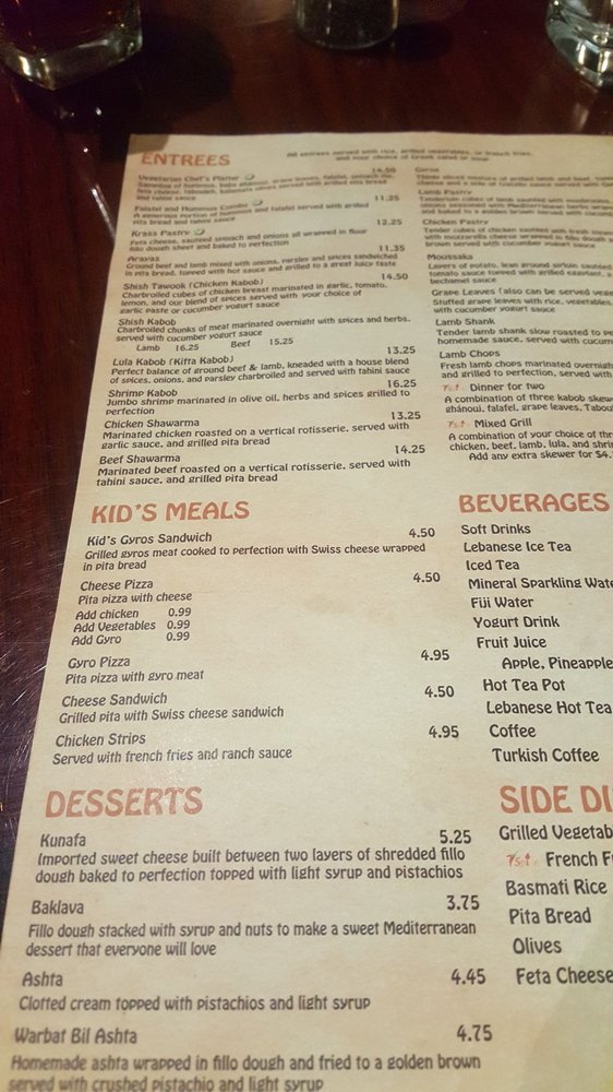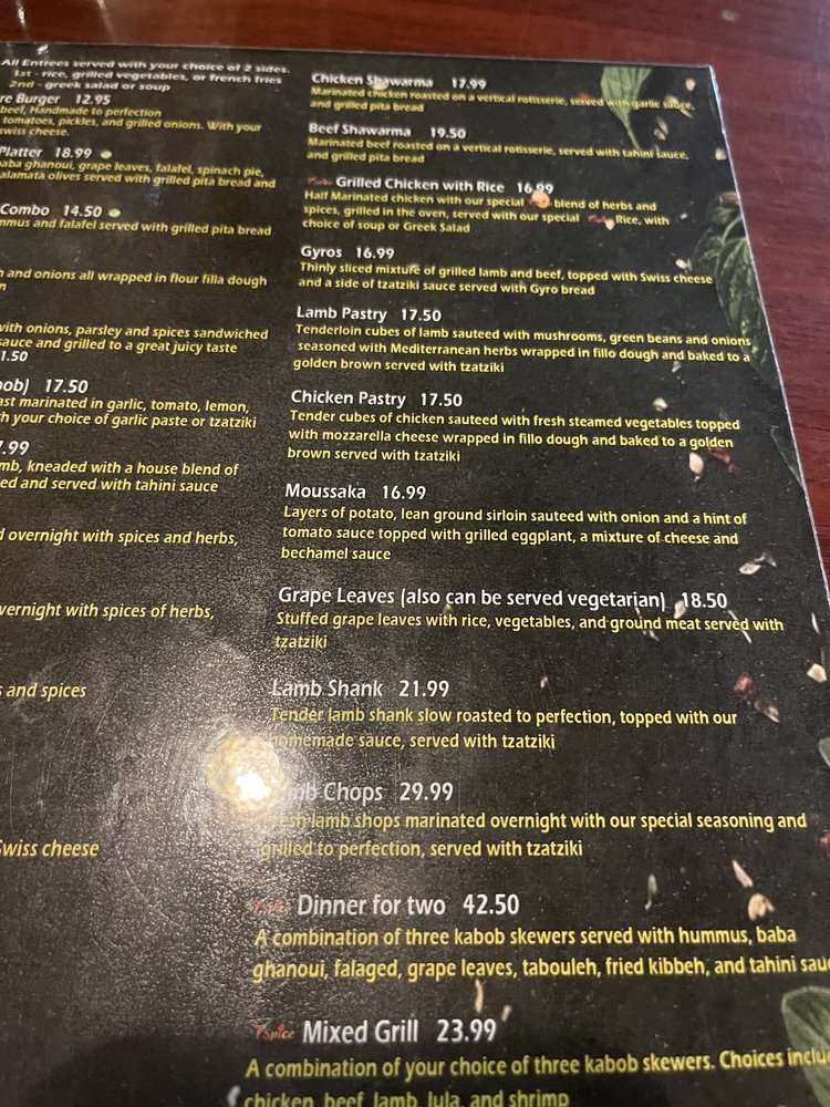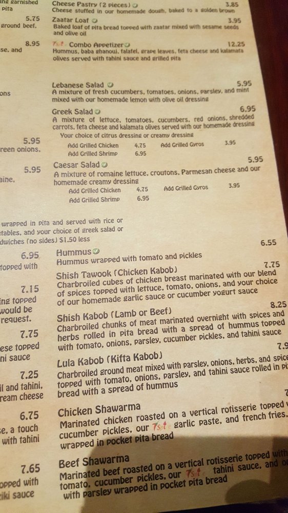 Charbroiled lamb or beef, marinated overnight with spices and herbs, and rolled in pita bread with a spread of hummus. Topped with tomatoes, onions, parsley, cucumber, pickles, and tahini sauce. Can be served with your choice of side and either a soup or salad.
